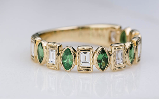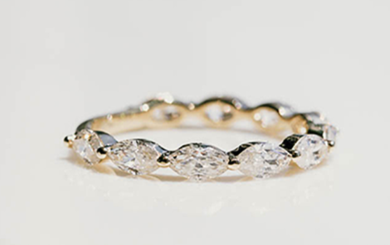 In 2021, Paige W custom designed a marquise outline diamond eternity wedding band in 14K yellow gold using her heirloom diamonds: “I’ve been working with Jenny and her team for years. It’s always an amazing experience and even better work! They have created custom pieces for me and even worked with me to design my dream wedding rings. Their attention to detail amazes me with every project. Jenny and her team are truly great people to work with!”